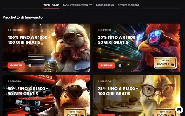 Quando ti iscrivi a RoosterBet Casino, puoi richiedere un pacchetto di benvenuto su quattro depositi con deposito minimo di €20 ogni volta e requisito di puntata 40x. Il primo deposito offre un match del 100% fino a €1.000 più 100 giri gratis, seguito da un bonus sul secondo deposito del 50% fino a €1.000 più 50 giri gratis, un bonus sul terzo deposito del 50% fino a €1.500 più 50 giri gratis e un bonus sul quarto deposito del 75% fino a €1.500 più 100 giri gratis. Questo RoosterBet bonus è pensato per distribuire il valore su più sessioni invece di spingerti a usare tutto in un solo giorno.
